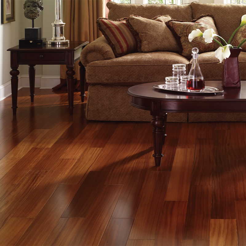 Brazilian Teak Solid Hardwood Flooring has a crimson tone, along with a medium gloss and smooth natural wood surface. This flooring is perfect for homes with high traffic, including homes with pets and kids.